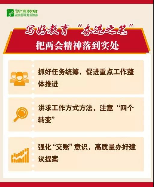 一是抓好任務統籌,促進重點工作整體推進。要深入學習總書記在兩會期間的重要講話精神,學習政府工作報告特別是關于教育的部署,把落實兩會對教育工作的部署與中央政治局常委會工作要點、中央教育領導小組工作要點、教育現代化2035及五年實施方案等有機結合,以義務教育、學前教育、職業教育、高等教育、加強教育體系中的薄弱環節、教師待遇、教育投入、脫貧攻堅等八方面工作為重點,系統推進、相互借力、整體提升。