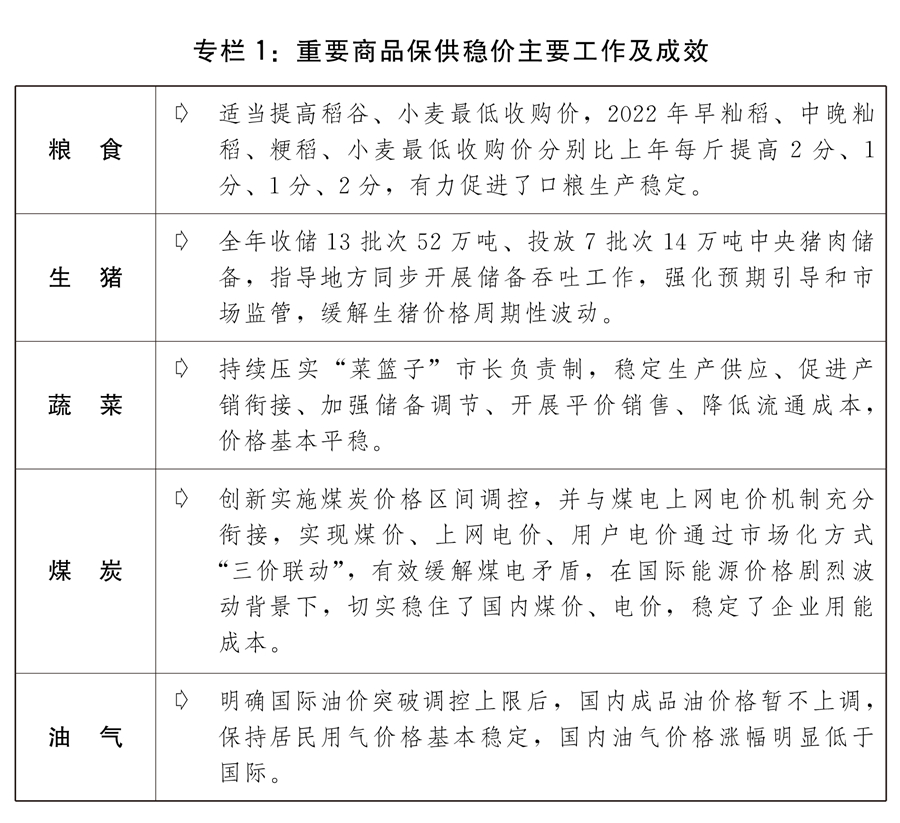 三是重要商品保供穩價進一步加強。推進重要民生商品價格調控機制落地見效,加強產運銷銜接和進出口、儲備吞吐調節,強化預期引導,促進價格平穩運行。堅持糧食最低收購價政策托底定位,適當提高稻谷、小麥最低收購價,穩定口糧生產。壓實“菜籃子”市長負責制,加強生豬市場調控,緩解生豬豬肉價格大幅波動。規范價格指數行為,期貨現貨市場聯動監管明顯加強。創新構建煤炭價格調控監管長效機制,引導煤炭價格在合理區間運行,積極應對國際油氣價格大幅上漲,保障居民用電用氣需求和價格穩定。