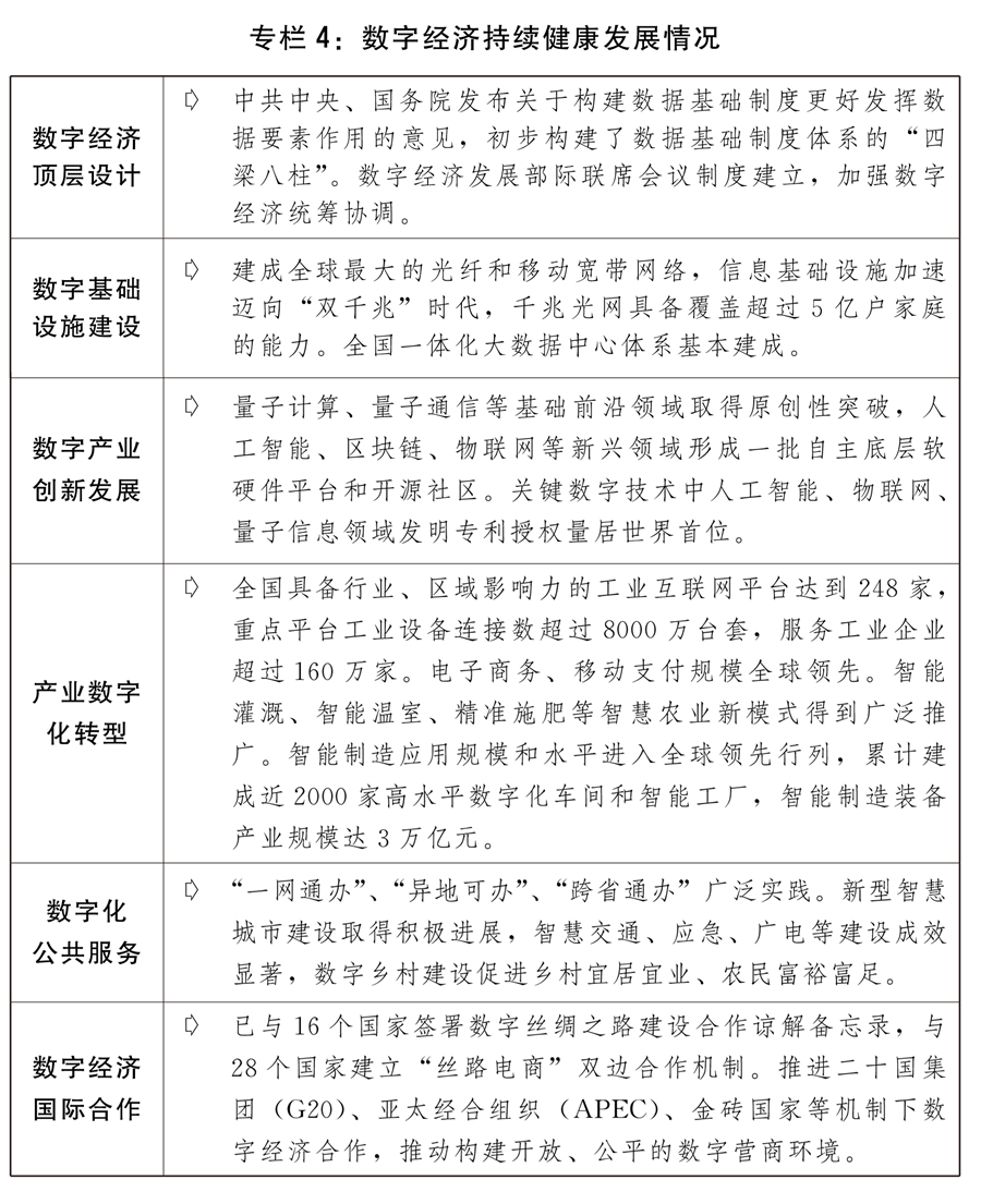 三是數字經濟持續健康發展。制定實施構建數據基礎制度更好發揮數據要素作用的政策文件,加快完善數據基礎制度體系,統籌推進數據確權、流通交易、收益分配、安全治理。數字經濟和實體經濟深度融合發展,“東數西算”工程全面實施,國家算力網絡加快構建,加強對樞紐節點算力基礎設施適度超前建設的政策支持,深入推進傳統產業、中小企業數字化轉型,“上云用數賦智”水平不斷提升。信息通信設施加快發展,第五代移動通信(5G)建設全球領先,全年新建5G基站88.7萬個,累計建成231.2萬個,占全球總數的60%以上。寬帶光纖網絡加速布局,千兆城市已超過110個。實現平臺經濟常態化監管,平臺經濟規范健康持續發展的基礎進一步夯實。