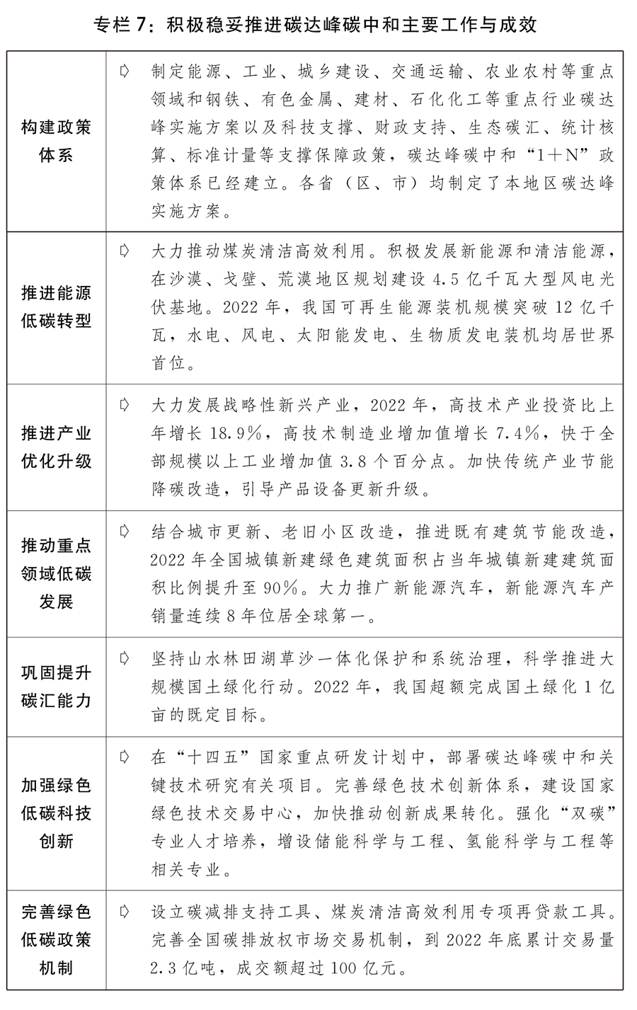 二是碳達峰碳中和積極穩妥推進。碳達峰碳中和“1+N”政策體系構建完成,重點領域碳達峰實施方案和配套保障措施制定出臺,“碳達峰十大行動”扎實推進。全國碳排放權交易市場平穩運行。堅持“先立后改”,加快建設先進清潔支撐性煤電,推動煤電機組節能降碳改造、靈活性改造、供熱改造“三改聯動”,積極發展新能源和清潔能源,第一批以沙漠、戈壁、荒漠地區為重點的大型風電光伏基地加快建設,我國可再生能源總裝機突破12億千瓦。重點行業節能降碳大力推進,提高新建建筑節能水平,積極發展綠色建筑,大力推廣新能源汽車,持續推動充電基礎設施建設,加快推進大宗貨物和中長距離貨物運輸“公轉鐵”、“公轉水”。單位國內生產總值二氧化碳排放下降0.8%。積極參與聯合國氣候變化沙姆沙伊赫大會各項談判磋商,推動大會取得積極成果。