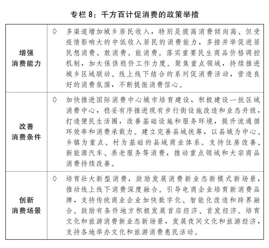 一是綜合施策釋放消費潛力。把恢復和擴大消費擺在優先位置,增強消費能力,改善消費條件,創新消費場景。順應居民消費升級趨勢,打造內容豐富、品質精良、結構合理的高質量消費供給體系,持續提升傳統消費,加快培育新型消費,不斷壯大消費熱點。穩定汽車等大宗消費,強化停車設施建設改造,優化停車設施供給結構,加快推進公路沿線、交通樞紐場站、居住區等充電設施設備建設,推動公共領域車輛全面電動化。鼓勵有條件的地方對購買綠色智能家電、綠色建材等予以支持,持續開展家電生產企業回收目標責任制行動。采取有效措施推動生活服務消費恢復,規范旅游市場秩序,大力發展城市微旅游、鄉村旅游和短途周邊游。落實帶薪休假制度。推進即時零售、直播電商、云展會等新模式健康發展,拓展沉浸式交互式購物體驗。支持剛性和改善性住房、新能源汽車、養老服務、教育醫療文化體育服務等消費。引導培育信息消費。開展智慧商圈、智慧商店、智慧景區、旅游城市和綠色商場示范創建,擴大綠色產品供給和消費。促進老字號創新發展。高水平辦好2023年中國品牌日系列活動,不斷提升中國品牌知名度和影響力,推動國潮品牌消費繁榮發展。營造安心放心的消費環境,加大消費品質量安全監管力度,強化消費者權益保護。