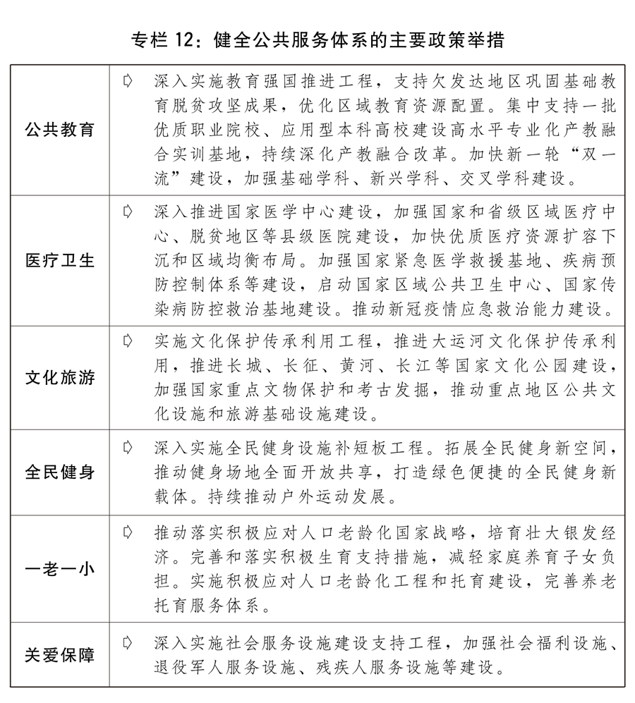 六是健全公共服務體系。出臺新版國家基本公共服務標準,開展基本公共服務均等化監測評估。持續推動生活性服務業補短板上水平,研究出臺推進高品質生活城市建設的政策措施。加強農村公共服務體系建設,健全常住地提供基本公共服務制度。深入實施積極應對人口老齡化國家戰略,發展養老事業和養老產業,擴大普惠養老供給,構建居家社區機構相協調、醫養康養相結合的養老服務體系,加強老年健康服務和管理,研究支持銀發經濟發展的政策體系。推動落實積極生育支持措施,發展普惠托育服務體系,降低生育、養育、教育成本,促進人口長期均衡發展。持續完善“一老一小”服務體系,擴大養老托育服務供給。有序推進第二批國家兒童友好城市建設。大力發展社會主義先進文化,實施文化保護傳承利用工程,加大文物和文化遺產保護力度,健全現代公共文化服務體系,推進實施國家文化數字化,創新實施文化惠民工程,建好用好國家文化公園,推動智慧廣電、智慧旅游建設,促進文化和旅游深度融合發展。繁榮發展哲學社會科學。實施全民健身設施補短板工程,推動構建更高水平的全民健身公共服務體系。推動家政進社區,提升基層家政服務網點服務能力。推動優撫醫院、光榮院改革提質,加強烈士紀念設施提質改造,繼續加強精神衛生福利設施、省級盲人按摩醫院等建設。加強公共法律服務體系建設。