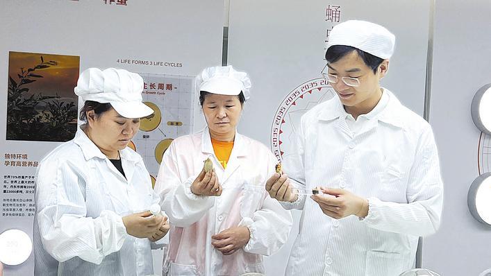 “蛹蟲草又叫北冬蟲夏草,是蟲草菌和柞蠶蛹的復合體。”尹雨龍說。在蛹蟲草體驗館,一個個展示瓶里,展示著不同階段的蛹蟲草,一側的智慧顯示屏上,蛹蟲草加工和提取車間的實時景象一目了然,全過程可視化、可追溯。