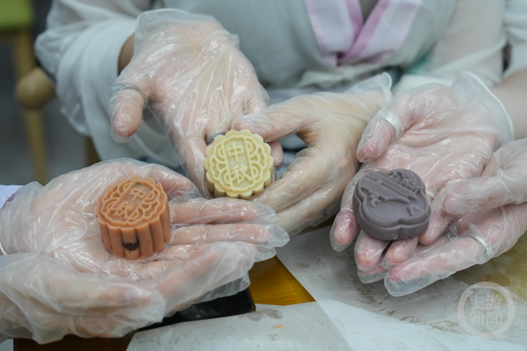 除了常規形狀,同學們還別出心裁地制作了?;铡⑻一?、玉兔等多種款式的月餅。