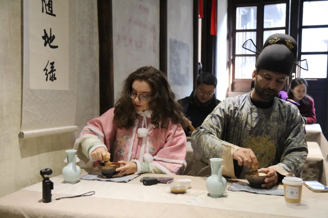 “原來喝茶有這么多工序,很有意思?!眮碜酝炼涞乃灸龋贿咉w驗著點茶的每一個細節,一邊用云臺相機記錄下全過程:“我打算把視頻上傳到我的社交媒體賬號上,讓我家鄉的人了解中國茶文化,感受中國年味?!狈諊惺愕狞c茶現場,也讓大家對宋朝人們的風雅生活有了沉浸式的感受。來自巴基斯坦的Wali對活動環境充滿好奇:“這樣的房子太有風格了,非常特別,這個活動也很棒?!?/span>